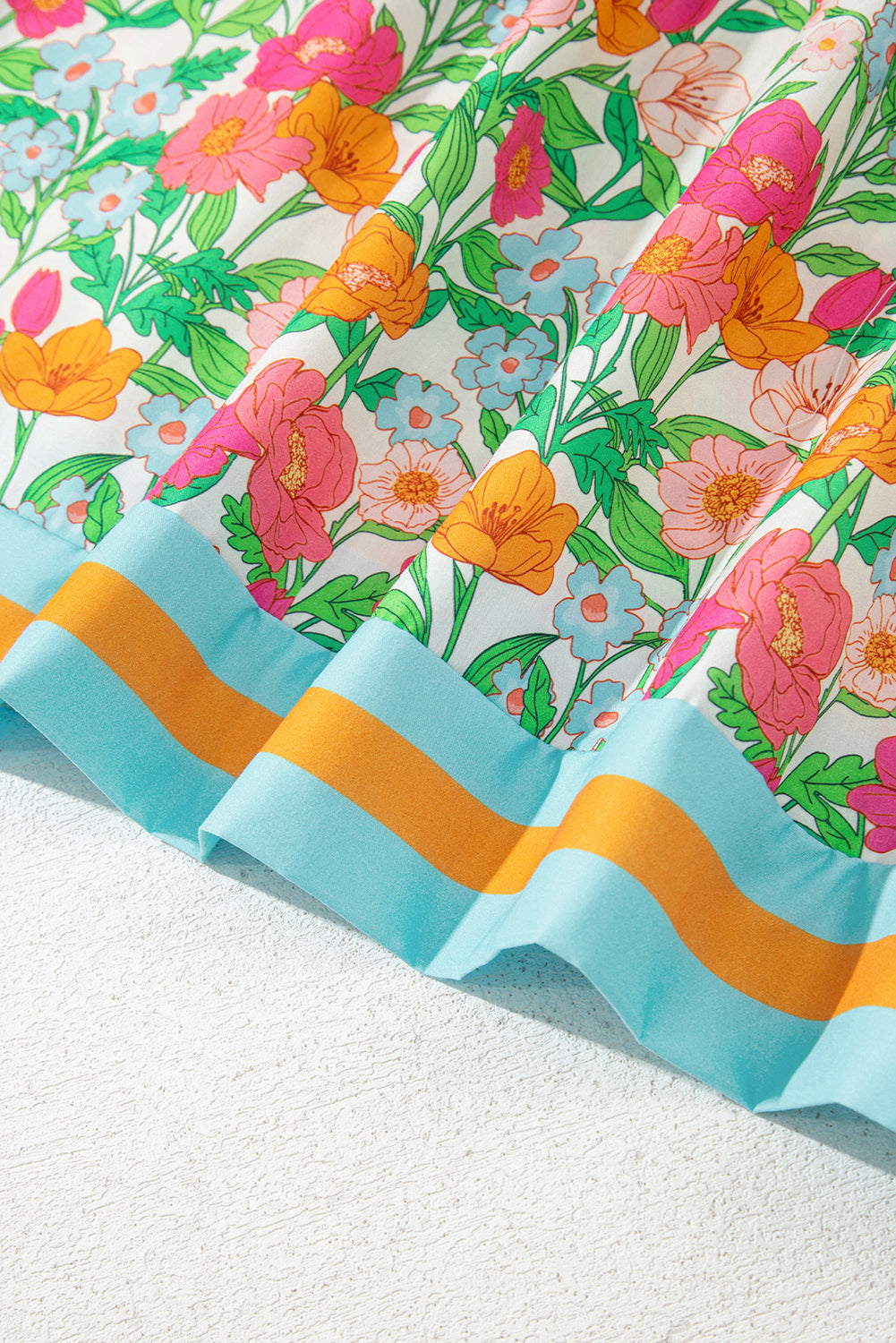Green Floral Print Striped Trim Tie Neck Puff Sleeve Babydoll Blouse